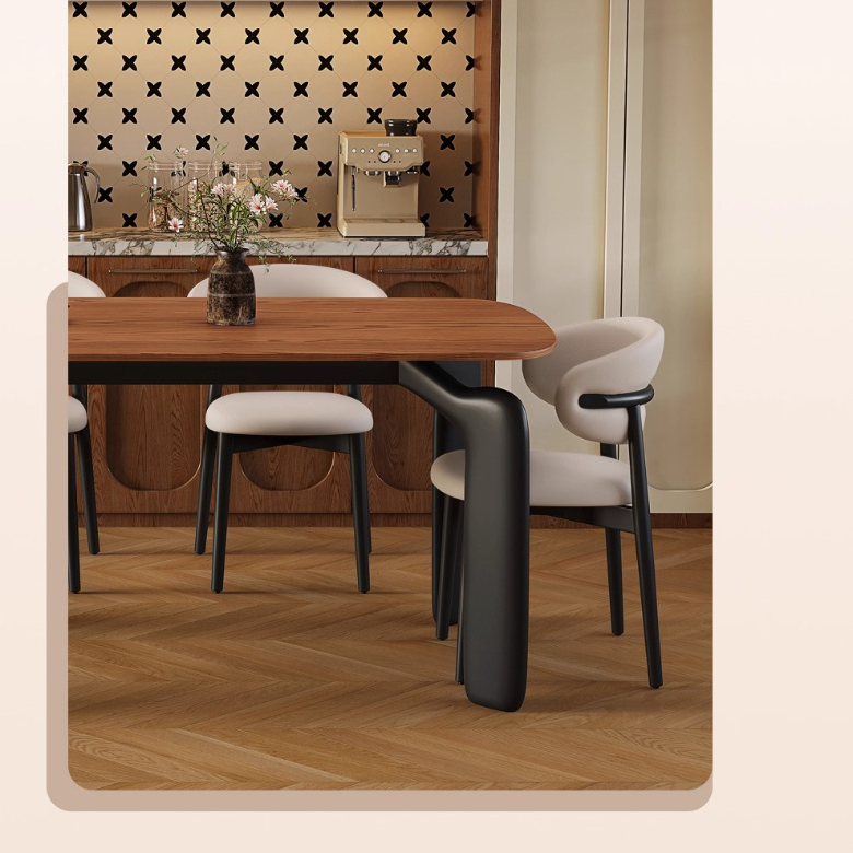 Matching chairs are upholstered in PU leather with high-resilience sponge padding. Designed with ergonomic principles, the Lingzhi chair and horn chair offer optimal comfort for family dining.