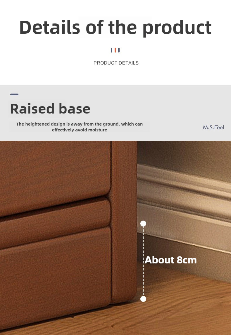 Equipped with 8cm raised base design that prevents ground moisture damage. Combined with dust-proof cabinet doors, this dual protection system ensures long-lasting furniture durability in various environments.