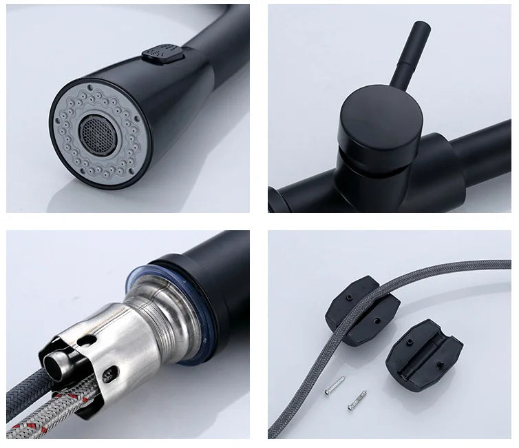 1. Pull-out faucet with gravity retraction system 2. Hot and cold water mixer 3. Dual-mode water outlet 4.304 stainless steel material 5. High-quality ceramic ink cartridges 6. High quality bubbler