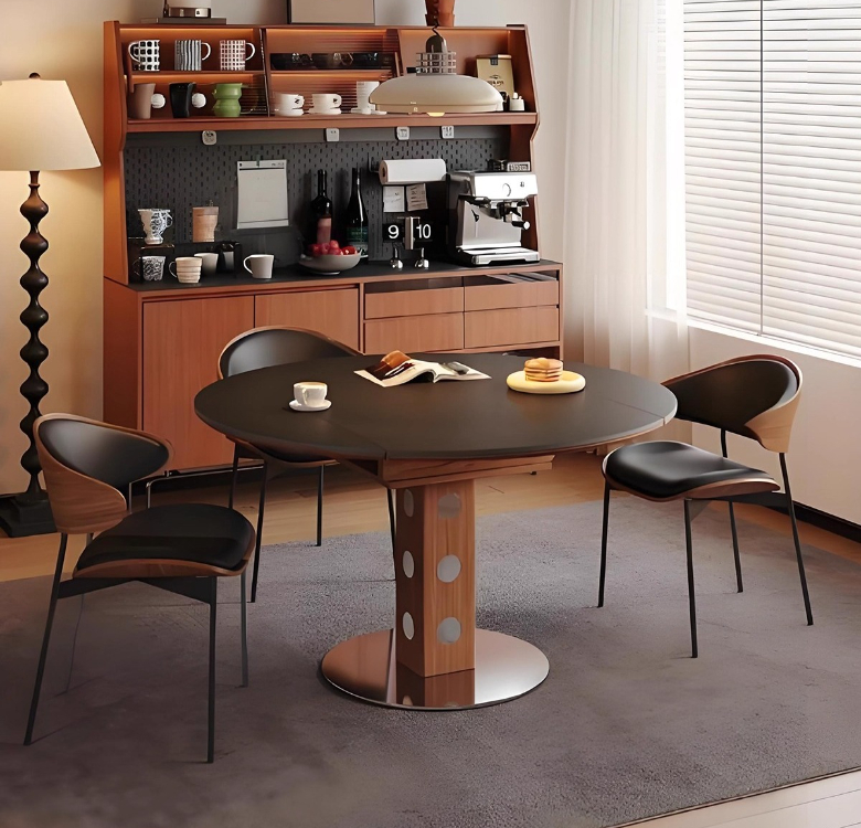 Smartly transforms from space-saving square table (ideal for 4-6 people) to expansive round table (accommodates 8-10 guests). The rotation mechanism with safety lock ensures smooth transition between configurations.